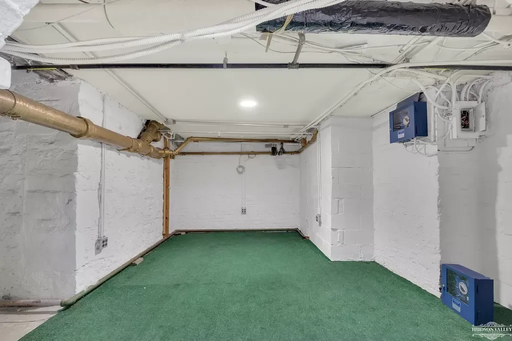 The lower level maintains the apartment’s commitment to functional design with exposed mechanical systems that have been painted white to blend seamlessly with the walls and ceiling. Rather than attempting to hide these elements behind expensive false ceilings, the design embraces them as part of the apartment’s authentic urban character. This honest approach to the building’s infrastructure adds to the space’s loft-like appeal while maintaining maximum ceiling height.