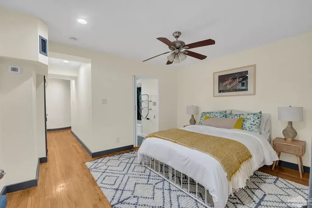The master bedroom, accessible through a hallway that provides acoustic and visual privacy from the main living areas, offers a serene escape from the energy of Manhattan. This generously proportioned room easily accommodates a queen-sized bed with a elegant white metal frame that combines vintage charm with contemporary simplicity. The bed is dressed in premium linens, including crisp white sheets, plump pillows, and a textured throw in warm golden tones that adds both visual interest and an extra layer of comfort for cool evenings.