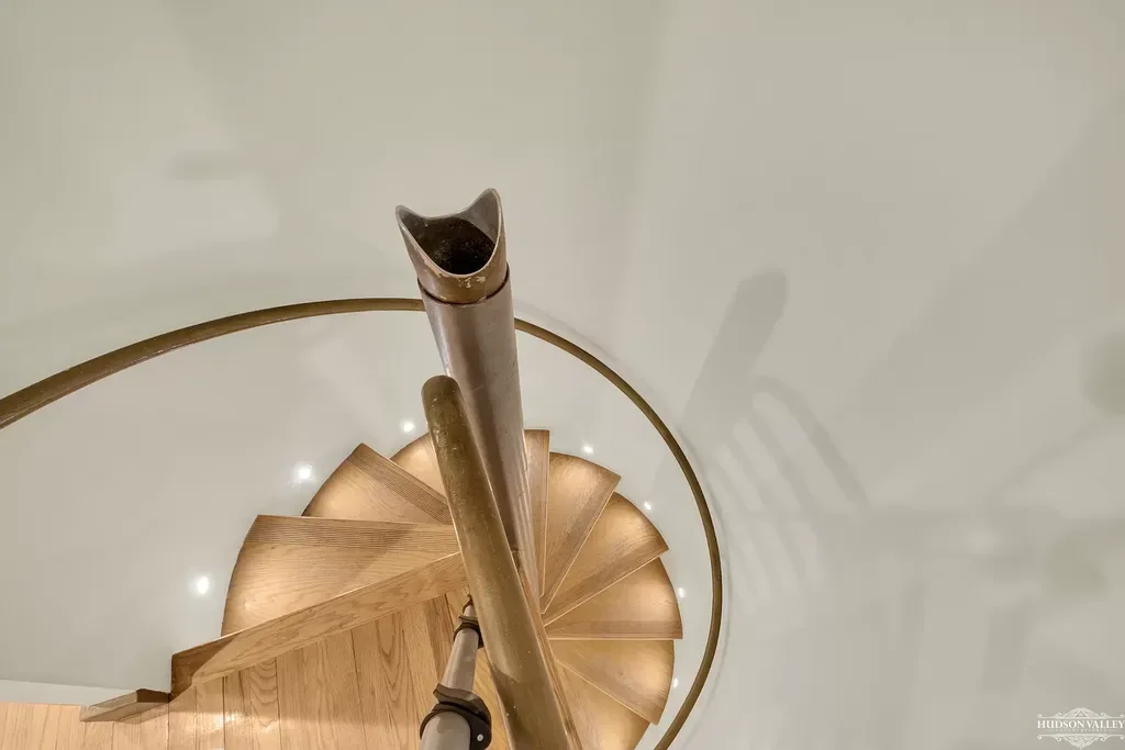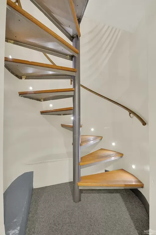 The journey to the apartment’s lower level begins with one of its most striking architectural features: a contemporary spiral staircase that serves as both functional element and sculptural focal point. The staircase’s central column, finished in sophisticated gray metal, provides robust support while maintaining a sense of visual lightness. Warm wooden treads spiral around this central spine, their natural grain and honey tones providing a beautiful contrast to the industrial metal structure.