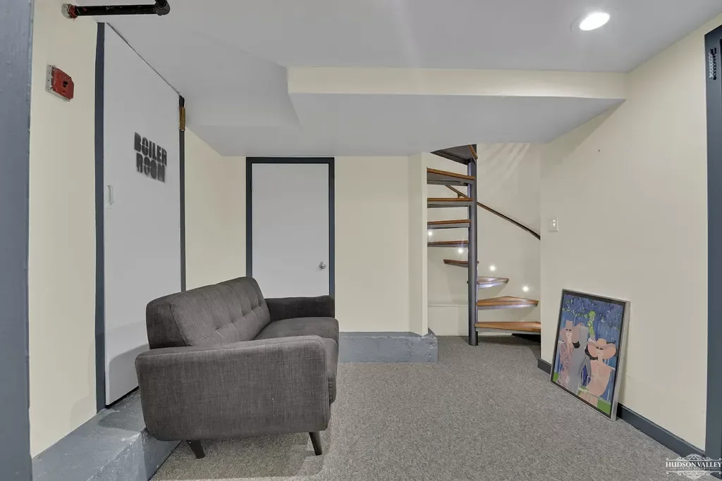 The lower level reveals itself as a remarkable bonus space that significantly expands the apartment’s living options. This versatile area can serve multiple functions depending on guests’ needs: a second bedroom for larger groups, a private office for those needing to work during their stay, an entertainment room for movie nights, or a quiet retreat for reading and relaxation. The space is furnished with a comfortable gray tufted sofa that can double as a sleeping surface when needed, providing flexible accommodation options.