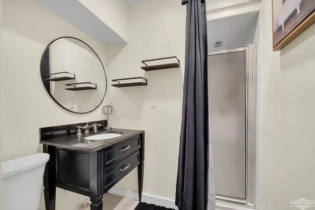 The bathroom represents a masterclass in making the most of urban space while maintaining a sense of luxury and sophistication. The vanity, a striking piece in dramatic black with traditional furniture-style legs, provides both storage and style. Its marble top offers generous space for toiletries and morning routines, while drawers below keep personal items organized and out of sight. A large circular mirror above the vanity reflects light throughout the space, making the bathroom feel larger and brighter.