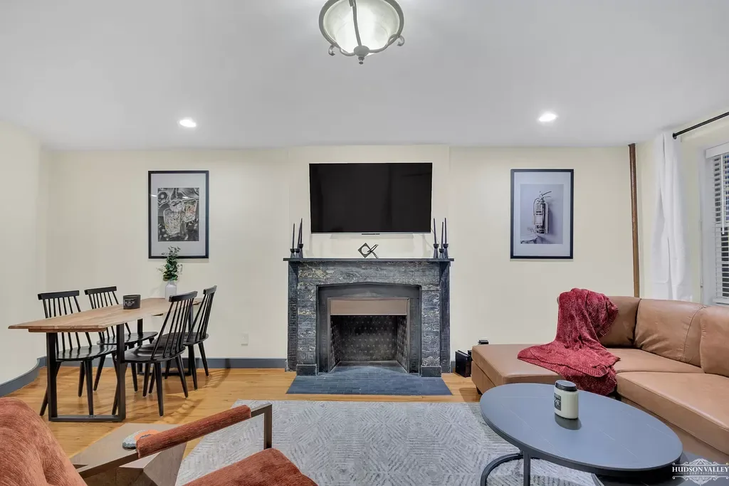 The living area serves as the social nucleus of the home, anchored by a striking stone fireplace that combines contemporary design with classic appeal. The fireplace surround, crafted from carefully selected gray stone with subtle natural variations, rises elegantly to frame a wall-mounted television, creating an entertainment center that satisfies both aesthetic and practical considerations. The mantel provides the perfect platform for seasonal decorations or cherished objects, while the fireplace itself offers the rare luxury of a working hearth in a Manhattan apartment—an amenity that transforms chilly New York evenings into cozy, memorable experiences.