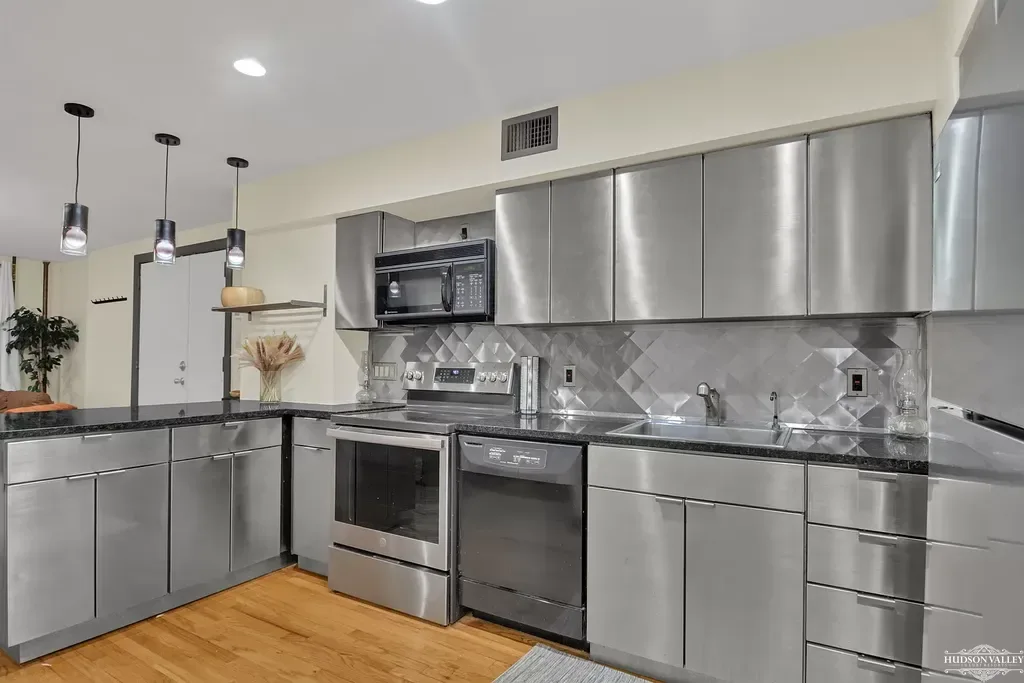The kitchen’s centerpiece is its substantial peninsula, which serves multiple functions with remarkable efficiency. Topped with dramatic dark granite countertops that feature subtle metallic flecks catching the light, the peninsula provides generous preparation space on the kitchen side while offering comfortable bar-height seating for three on the living area side. This dual functionality makes it ideal for everything from morning coffee and casual breakfasts to evening cocktails and late-night conversations. Three modern pendant lights, suspended from slender black cords and featuring cylindrical shades that direct light downward, illuminate the peninsula with both task lighting for food preparation and ambient lighting for dining.