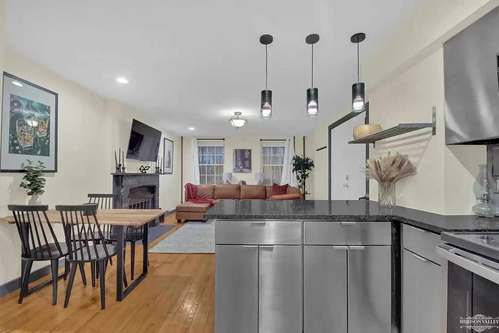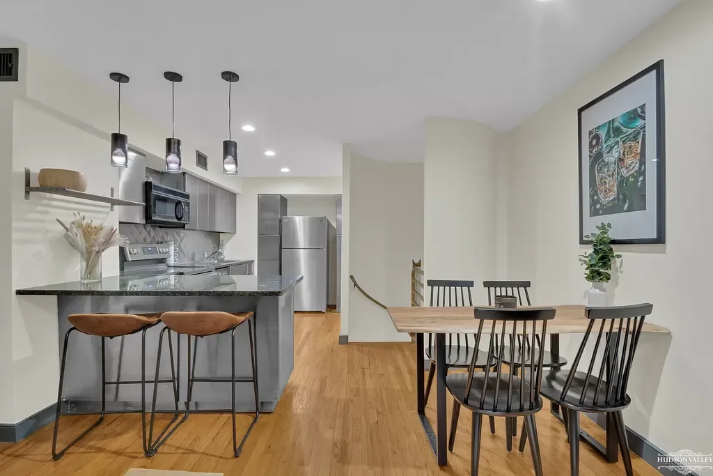 The dining area occupies a perfectly proportioned space between the kitchen and living room, benefiting from natural light during the day and the warm glow of carefully positioned lighting fixtures in the evening. A modern dining table with a natural wood top and sleek black metal legs provides comfortable seating for six, making it ideal for everything from intimate dinners for two to lively dinner parties with friends. The chairs, featuring classic Windsor-inspired spindle backs rendered in contemporary black, strike a perfect balance between comfort and style, their design echoing both the apartment’s modern aesthetic and the neighborhood’s historic character.