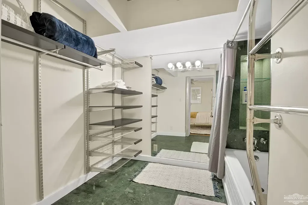 Multiple shelving levels offer organized storage for folded clothes, shoes, accessories, and luggage, while the open design makes it easy to see and access belongings. The green flooring in this area, a playful departure from the hardwood found elsewhere, adds personality while being practical and easy to clean. Overhead lighting ensures good visibility for selecting outfits, while the proximity to both bedroom and bathroom makes morning routines efficient and convenient.